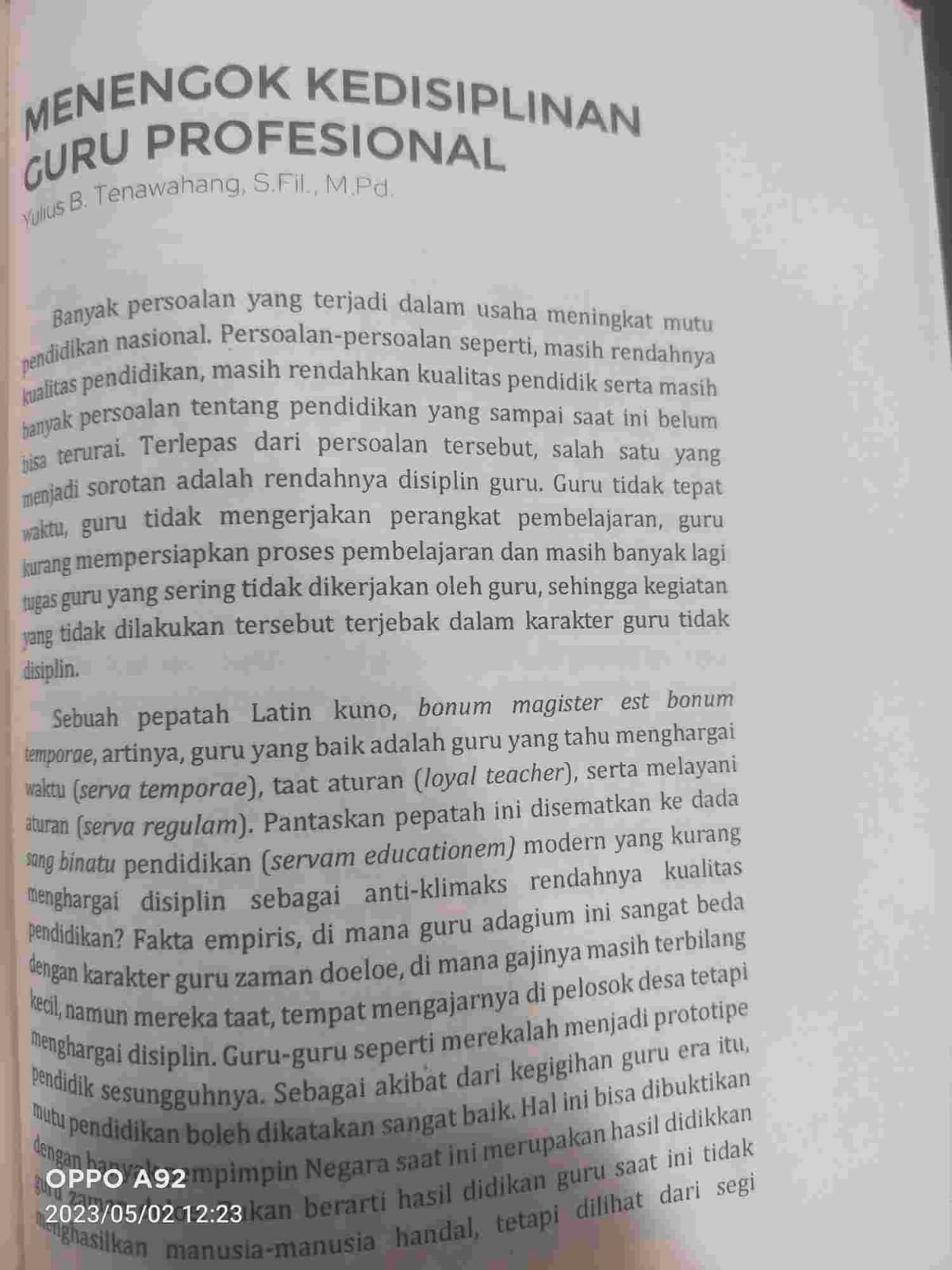 Namun apalah daya guru profesional belum tentu menjadi guru yang disiplin serta berwatak mulia. Fenomena di atas senada dengan apa yang disampaikan oleh Koordinator Pengawas SMA/SMK dan SLB Kabupaten Kupang Provinsi NTT, yang dilansir dari https://suaraamfoang.com/. Koordinator Pengawas (Korwas) SMA/SMK/SLB Kabupaten Kupang Dinas Pendidikan dan Kebudayaan Provinsi NTT, Stefen Tallo, S.Pd.,M.Pd., mengharapkan agar tidak boleh ada kompi: 07150014 (dibaca: kompi kosong tujuh lima belas kosong kosong empat belas) di setiap sekolah karena anggota kompi tersebut juga menjadi salah satu sumber masalah di sekolah.