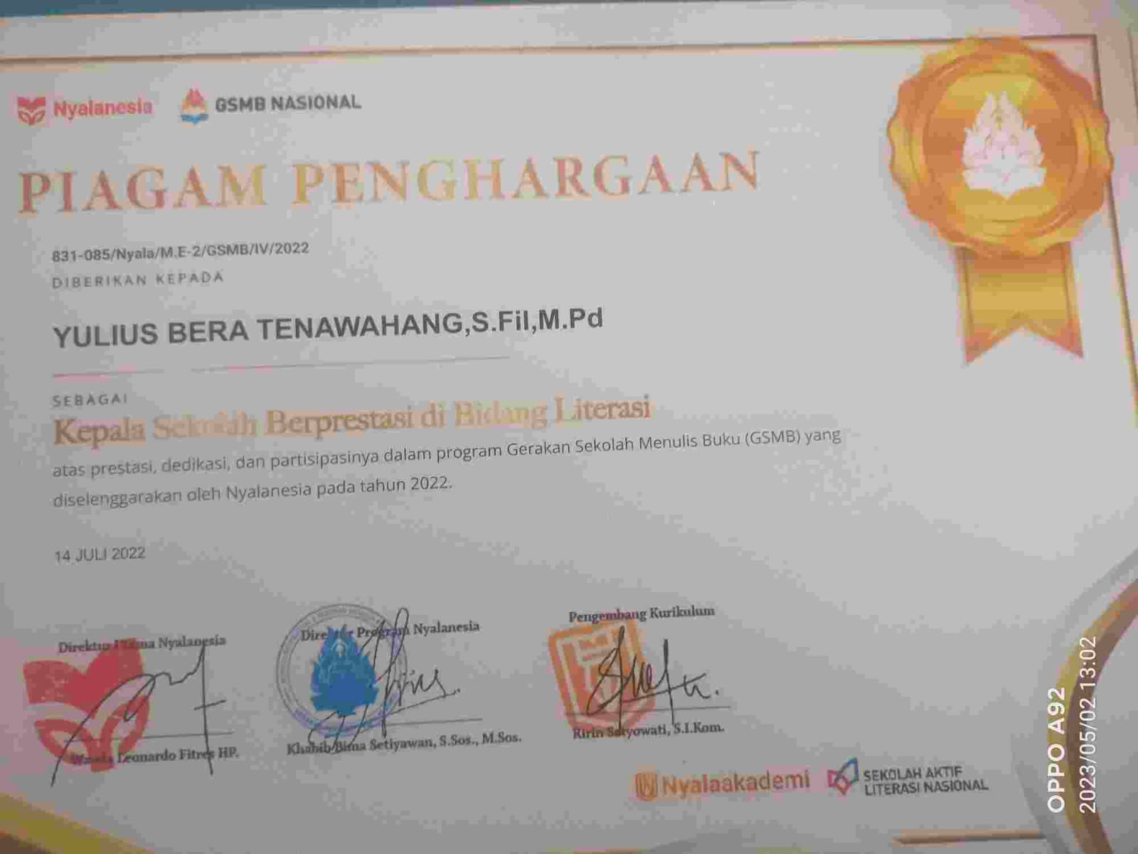 Melalui tulisan inilah Kepala SMA Negeri 2 Kupang Timur Yulius Bera Tenawahang, S. Fil., M. Pd meraih penghargaan sebagai Kepala Sekolah Berprestasi di Bidang Literasi Tingkat Nasional dan SMA Negeri 2 Kupang Timur dinobatkan menjadi Sekolah Aktif Literasi dalam Program Gerakan Sekolah Menulis Buku (GSMB) Nasional Tahun 2022.